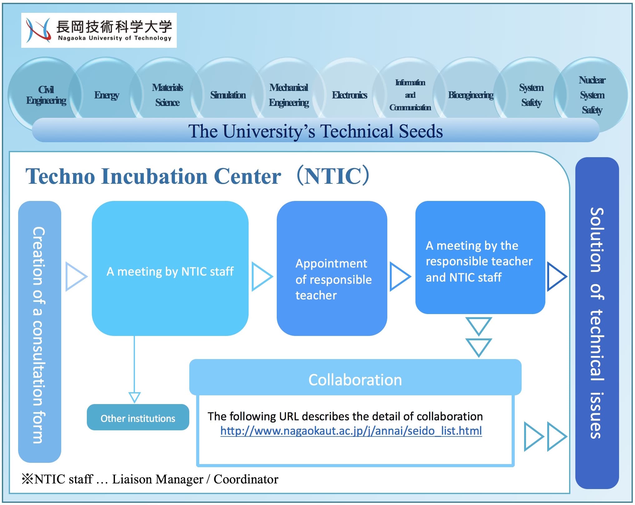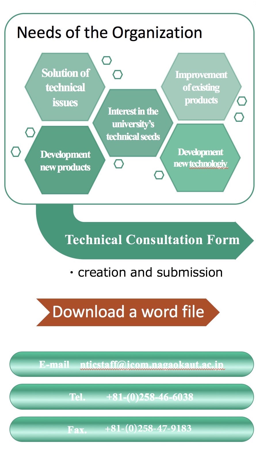 We will offer a meeting room for an interview at NTIC, and it can accommodate up to 12 people. Please come and visit NTIC liaison office first on the day of your consultation. We will guide you then. We'd like to consider your request, but in some cases, it may not be satisfied. After we receive your technical consultation form whose request date is filled out, a liaison manager will contact you by phone or e-mail to discuss and decide when to make an appointment with you.